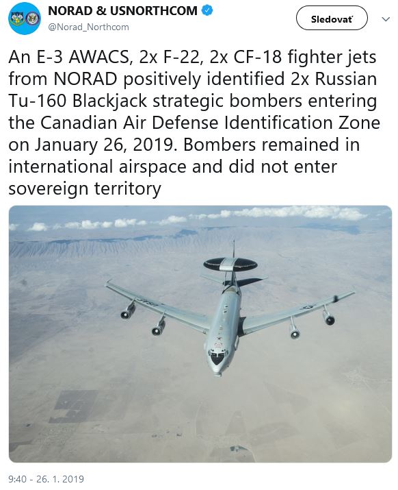 Zdroj https://spravy.pravda.sk/svet/clanok/49 ... mbarderom/ z 27.01.2019Stíhačky vzdušných síl Spojených štátov a Kanady vyslali cez víkend k 2 ruským bombardérom, ktoré sa pohybovali v arktickom regióne neďaleko severoamerického pobrežia. Informovala o tom v nedeľu 27.01.2019 agentúra AP. Severoamerické veliteľstvo protivzdušnej obrany (NORAD) oznámilo, že 2 stíhačky F-22 a 2 stíhacie lietadlá CF-18 identifikovali 2 ruské strategické bombardéry Tu-160 Blackjack, keď v sobotu 26.01.2019 dopoludnia vstupovali do oblasti, v ktorej hliadkujú Kráľovské kanadské vzdušné sily (RCAF)...