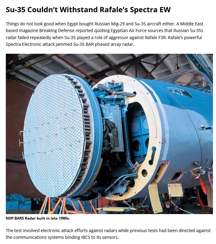 Jak velcí aktivističtí hlupáci jsou na globaldefensecorp nezvládající ani jednoduchou propagandu dokládá tvrzení o použití radaru BARS na Su-35. Ve skutečnosti má Irbis-E.translator: Dobře to nevypadá ani s nákupem ruských letounů Mig-29 a Su-35 v Egyptě. Blízkovýchodní časopis Breaking Defense s odvoláním na zdroje egyptského letectva uvedl, že ruské radary Su-35 opakovaně selhaly, když Su-35 plnily roli agresora proti Rafale F3R. Výkonný elektronický útok Rafale Spectra rušil radar Su-35 BAR s fázovanou soustavou.
