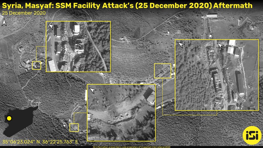 Podľa obrázkov „pred a po“ zdieľaných súkromnou izraelskou spravodajskou spoločnosťou boli v piatok v skorých ranných hodinách zničené najmenej štyri budovy v Masyaf.