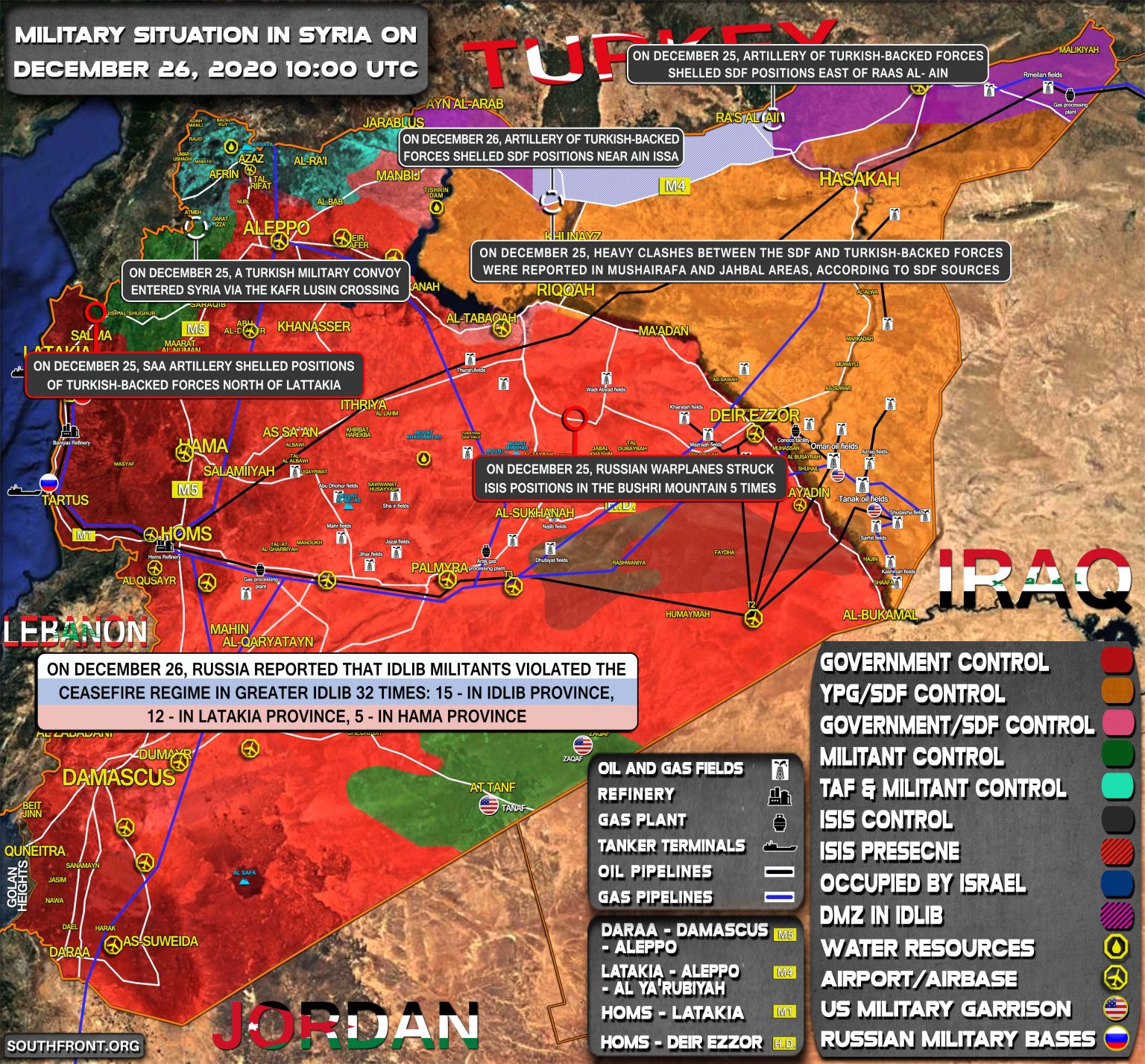 25. decembra boli podľa zdrojov SDF zaznamenané silné strety medzi sýrskymi demokratickými silami (SDF) a silami podporovanými Tureckom v oblastiach Mushairafa a Jahbal;