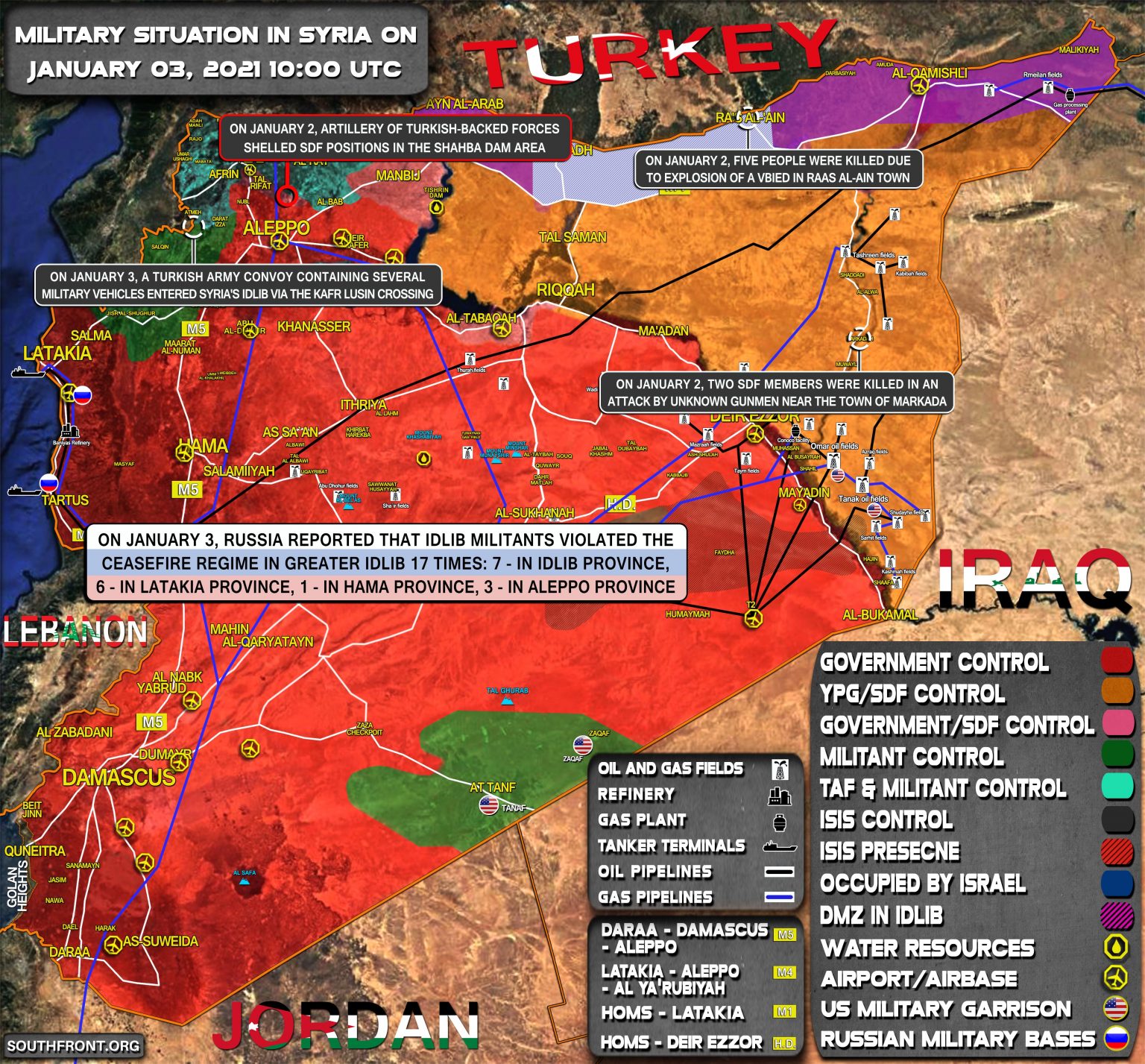 3. januára Rusko informovalo, že militanti z Idlibu porušili režim prímeria vo Veľkom Idlibe 17-krát: 7 - v provincii Idlib, 6 - v provincii Latakia, 1 - v provincii Hamá, 3 - v provincii Aleppo;