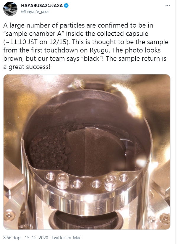 Japonská kapsle nesoucí vzorky z asteroidu Rjuga se v sobotu vrátila na Zemi. Přistála na poušti v jižní Austrálii, oznámila japonská vesmírná agentura JAXA na základě signálů z kapsle. Ta bude po vyzvednutí převezena z Austrálie do Japonska, kde bude teprve otevřena. Kapsle se před přistáním úspěšně oddělila od sondy Hajabusa 2, která bude dále pokračovat ve své vesmírné misi.