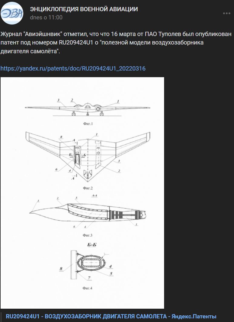 Časopis Avijejšnvik (Авиэйшнвик) uviedol, že 16.03.2022 od spoločnosti PAO Tupolev bol zverejnený patent č. RU209424U1 o "efektívnom modeli prívodu vzduchu do motora lietadla".
