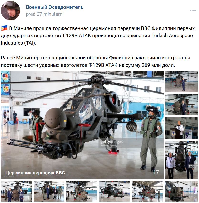 V Manile prebehla slávnostná ceremónia odovzdania VVS Filipín prvých 2 útočných vrtuľníkov T-129B ATAK vyrobené spoločnosťou Turkish Aerospace Industries (TAI). Predtým Filipínske ministerstvo národnej obrany uzavrelo zmluvu na dodávku 6 bojových vrtuľníkov T-129B ATAK v hodnote 269 miliónov $.