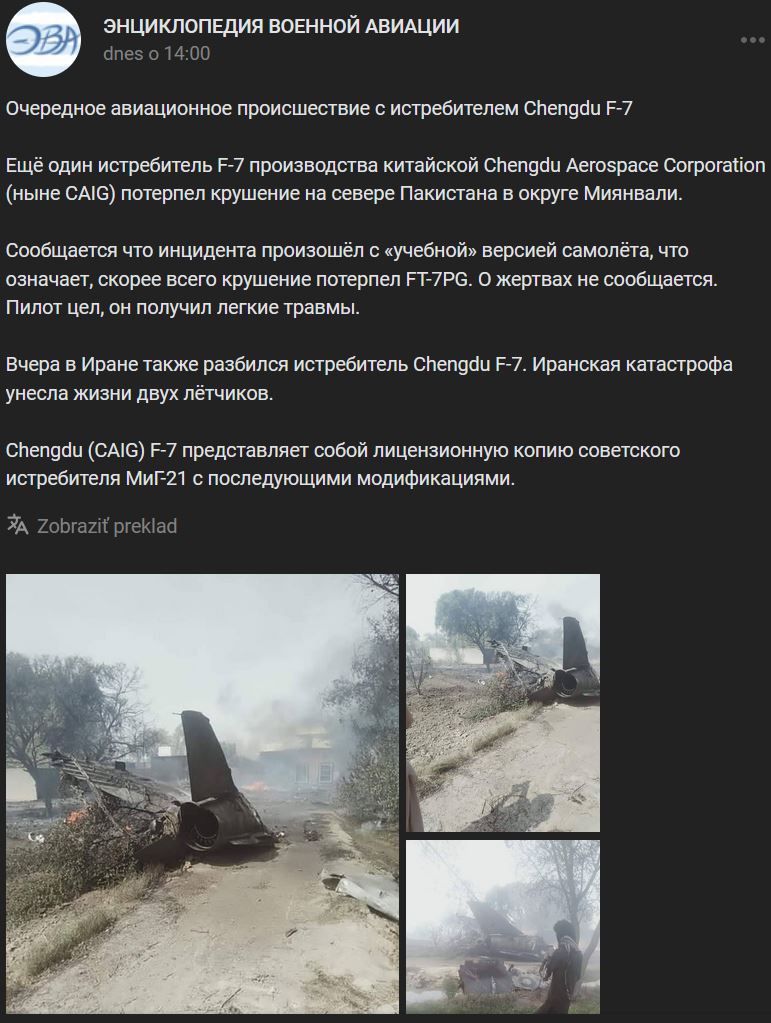 Streda 25.05.2022, Pakistan, lietadlo Chengdu FT-7P (klon MiG-21), pilot sa katapultoval