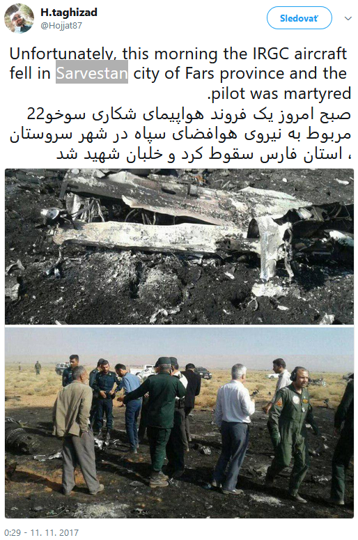 V sobotu 11.11.2017 v Iráne v okolí mesta Sarvestan v provincii Fars navarovalo lietadlo rodiny Su-22, pri ktorej pilot zahynul. Lietadlo patrilo Íránskej revolučnej garde "Islamic Revolutionary Guards Corps (IRGC)"