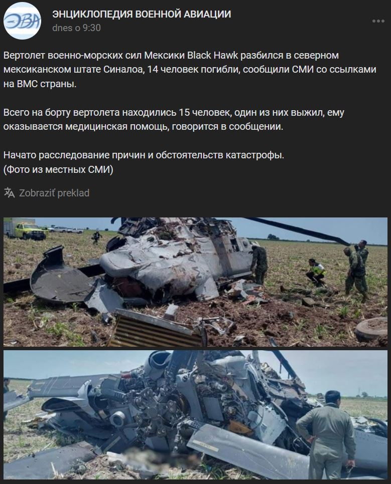 ↑ Vrtuľník mexického námorníctva Black Hawk sa zrútil v severomexickom štáte Sinaloa, 14 ľudí zahynulo, informovali médiá s odvolaním sa na námorníctvo krajiny. Na palube vrtuľníka bolo celkovo 15 ľudí, 1 z nich prežil a je ošetrovaný, uvádza sa v správe. Začalo sa vyšetrovanie príčin a okolností nehody. (Foto z miestnych médií)