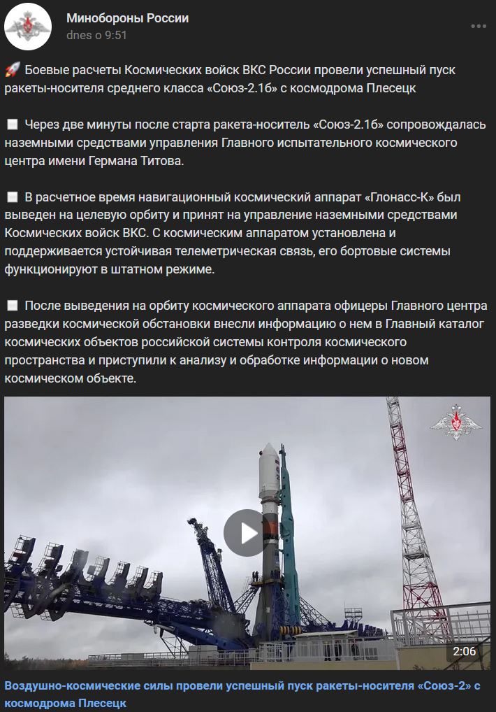 Vojenský personál Kozmických vojsk VKS Ruska uskutočnil úspešný štart nosnej rakety strednej triedy Sojuz-2.1b (Союз-2.1б) z kozmodrómu Pleseck (Плесецк). 2 minúty po štarte bola nosná raketa Sojuz-2.1b riadená pozemnými ovládacími prvkami Hlavného testovacieho vesmírneho strediska Germana Titova. V predpokladanom čase bola navigačná družica Glonass-K (Глонасс-К) navedená na cieľovú obežnú dráhu a prevzatá pozemnými zariadeniami Kozmických vojsk VKS. S družicou bola nadviazaná a udržiavaná stabilná telemetrická komunikácia, jej palubné systémy fungujú normálne. Po navedení družice na obežnú dráhu dôstojníci Hlavného centra spravodajstva / prieskumu vesmírnej situácie zadali / vložili informácie o nej do hlavného katalógu kozmických objektov ruského systému riadenia kozmického priestoru a začali analyzovať a spracovávať informácie o novom kozmickom objekte.