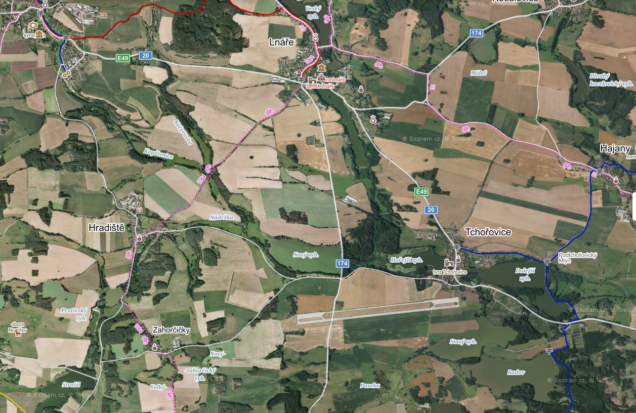 Je to už řada let. Fakt nevím, jak se to tam jmenovalo. Já jel po asfaltové okresc a on po uježděné travnaté ploše kolmo na tu silnici. Ty obce co jsi popsal tam jsou, měl jsem je někde po pravé ruce. Obá jsme zastavili, já na něj gestkuloval, že dám cígo on zamával a odletěl. Fakt startoval kolmo na tu silnici a to z čeho vypadalo používaně..