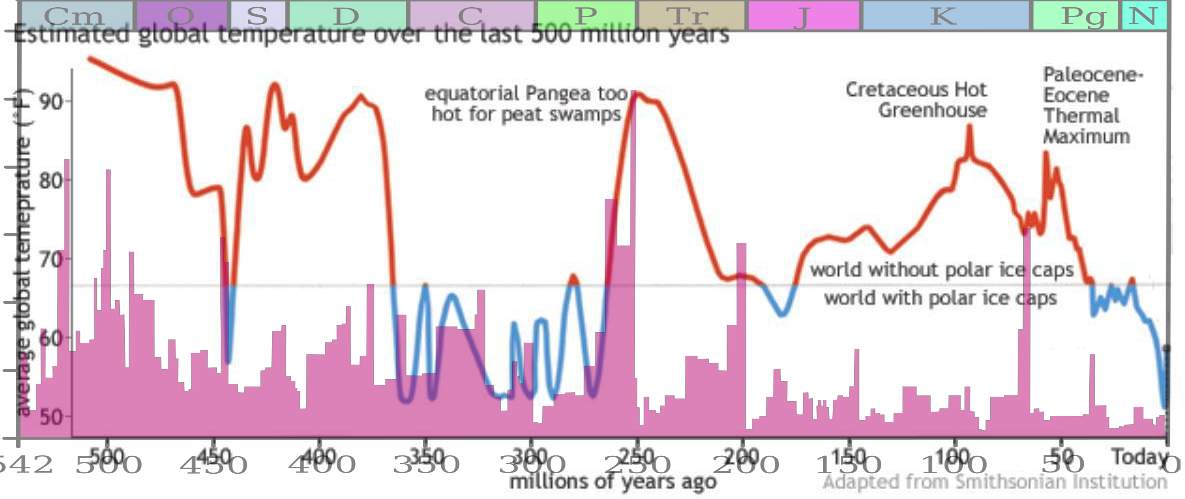 Odhad vývoje teploty Země za posledních 500 milionů let. Je patrné, že Země se v průběhu 50 milionů let postupně ochlazovala, ale nedávný nárůst zatím nedosáhl průměrné hodnoty.