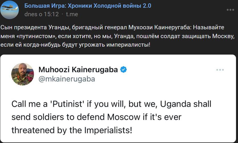 Syn prezidenta Ugandy, brigádny generál Muhoosi Kainerugaba: Nazvite ma "Putinistom" ak chcete, ale my, Uganda, pošleme vojakov na obranu Moskvy, ak ju budú niekedy ohrozovať imperialisti!