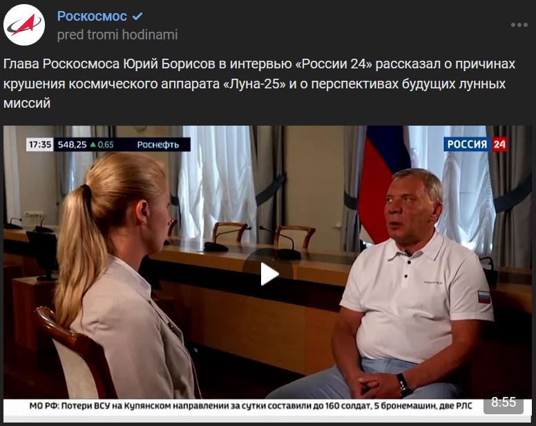 Šéf Roskosmosu Jurij Borisov (Юрий Борисов) v rozhovore pre "Rossija 24" hovoril o príčinách havárie kozmického aparátu Luna-25 (Луна-25) a o vyhliadkach budúcich lunárnych misií