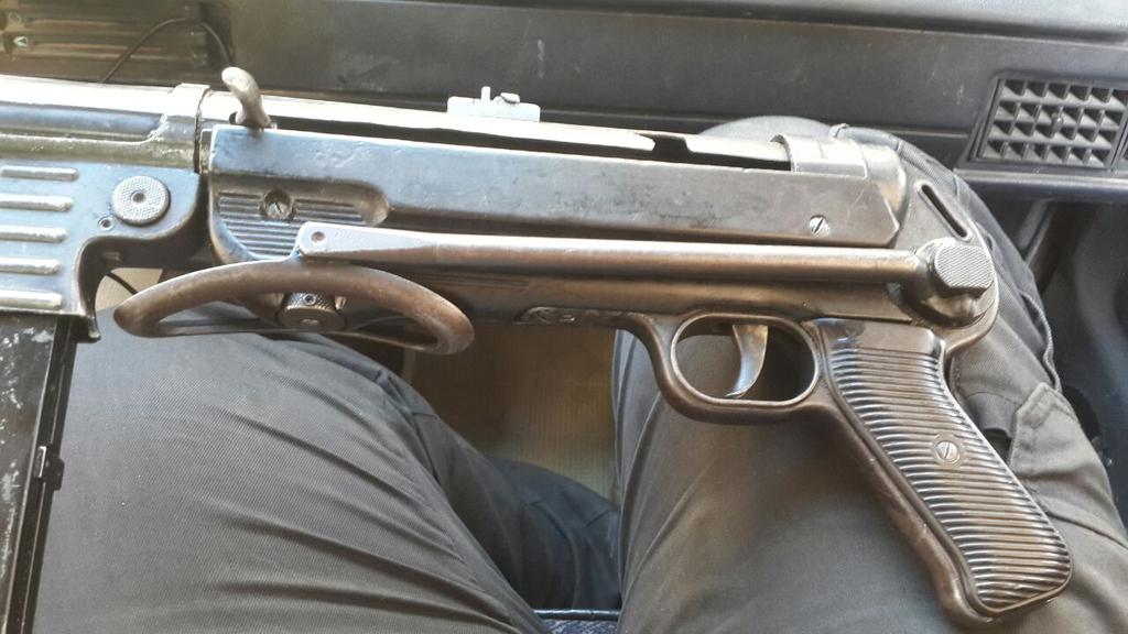 MP-40 z druhej svetovej vojny. Automobil je tiež zaujímavý - v Sýrii obľúbený Favorit.