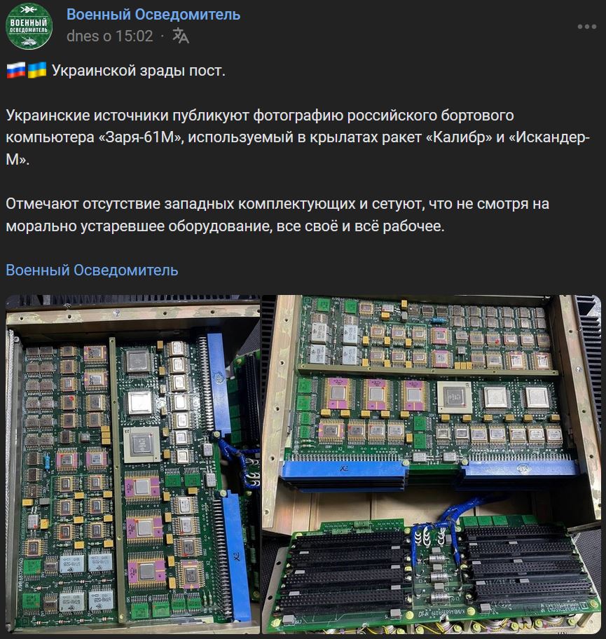 Ukrajinské zdroje zverejňujú fotografiu ruského palubného počítača "Zarja-61M" (Заря-61М), ktorý sa používa v raketách Kalibr (Калибр) a Iskander-M (Искандер-М). Konštatujú absenciu západných komponentov a sťažujú sa, že napriek zastaranému vybaveniu je všetko ich vlastné a všetko funguje.