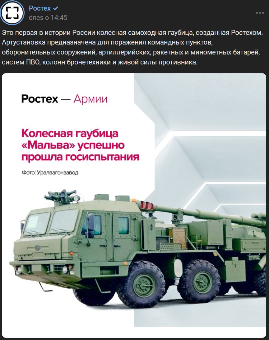 Rostech uvádza, že perspektívne 152mm samohybné delo 2S43 Maľva (2С43 Мальва) na podvozku BAZ-6010-027 (БАЗ-6010-027) úspešne prešlo štátnymi skúškami a už sa pripravuje na dodávku vojsku.