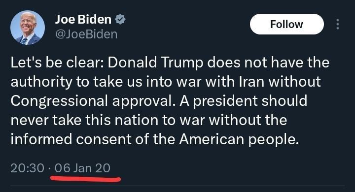 V souvislosti s Bidenovými nočními údery na Jemen se na internetu objevila připomínka výroku Joe Bidena o prezidentu Donaldu Trumpovi: "Řekněme si to jasně: Donald Trump nemá pravomoc vést nás do války s Íránem bez souhlasu Kongresu. Prezident by nikdy neměl vést tuto zemi do války bez informovaného souhlasu amerického lidu."
