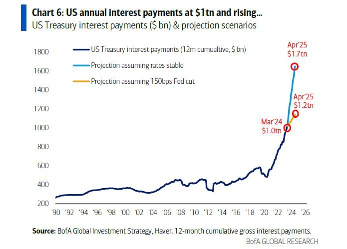 Splátky úroků z amerického dluhu dosáhnou 1,7 bilionu dolarů již v dubnu 2025. @banksta