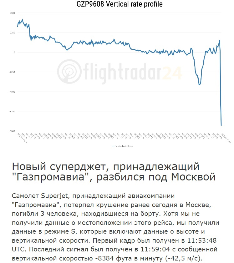 Profil letu (vertikálne zrýchelnia) havarovaného Superjet 100-95LR (RA-89049) = padal 42,5m/s: