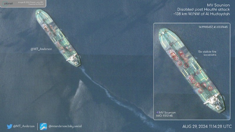 + družicový snímok MV Sounion - vidno 15 stôp po výbuchoch a horení