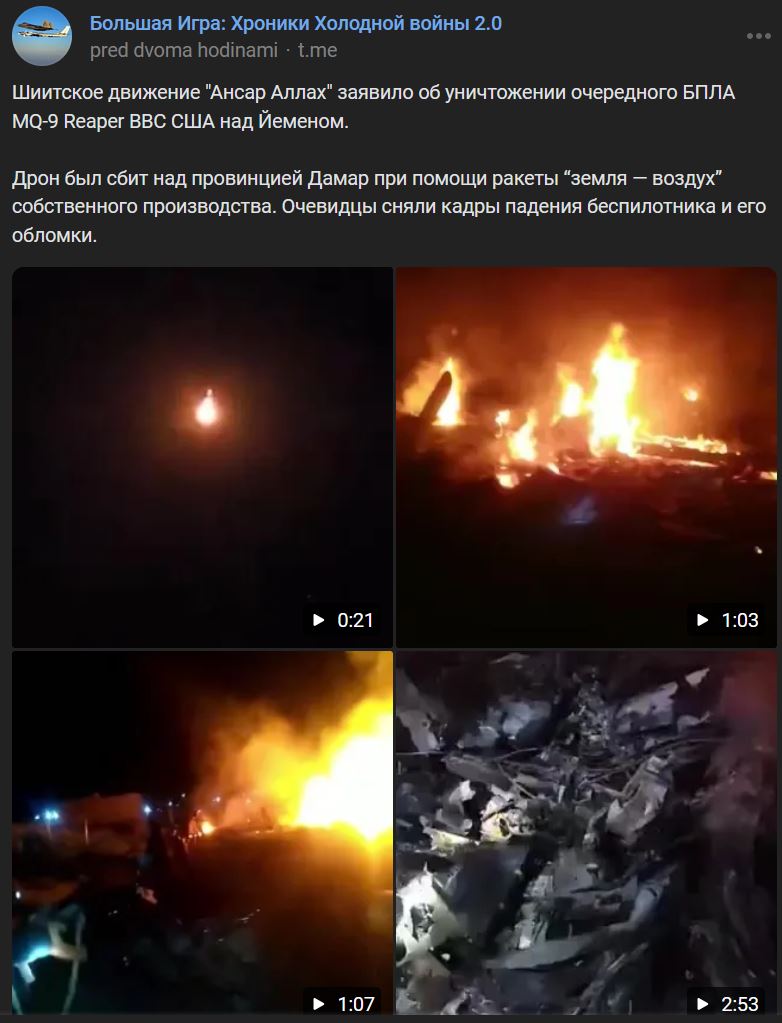 Šiitské hnutie "Ansar Allah" oznámilo zničenie ďalšieho BPLA MQ-9 Reaper VVS SŠA nad Jemenom. Dron bol zostrelený nad provinciou Damar pomocou podomácky vyrobenej rakety zem-vzduch. Očití svedkovia zachytili zábery zostrelenia dronu a jeho vraku.