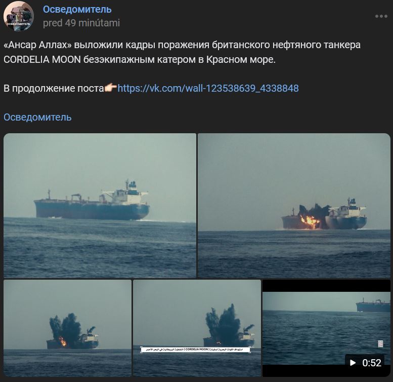 „Ansar Allah“ zverejnil zábery zásahu britského ropného tankera CORDELIA MOON bezposádkovým člnom (BEK = безэкипажным катером) v Červenom mori.