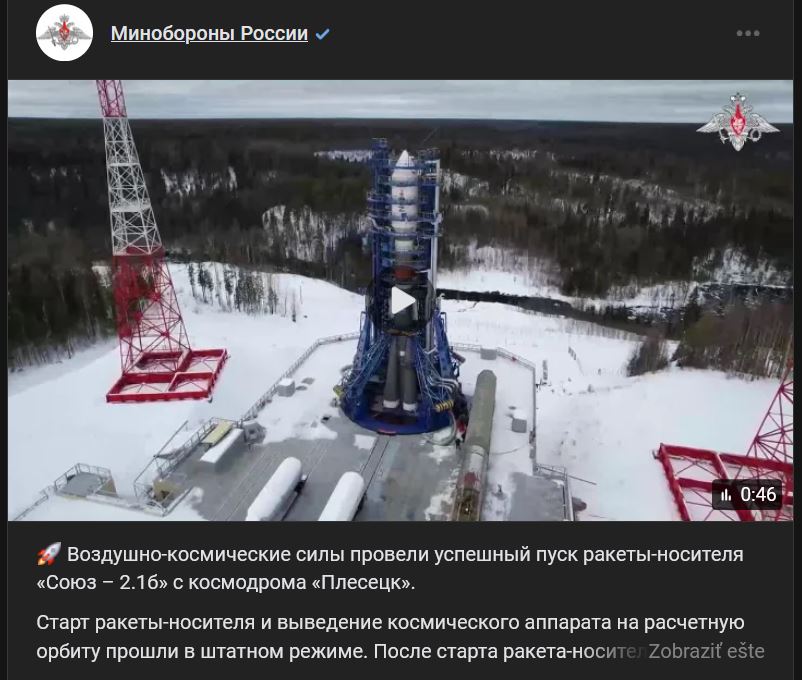 Vzdušno-kozmické sily uskutočnili úspešný štart nosnej rakety Sojuz-2.1b (Союз–2.1б) z kozmodrómu Pleseck (Плесецк).