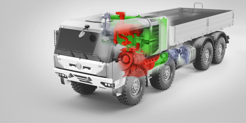 Součástí hybridního systému je osmiválcový vzduchem chlazený motor Tatra s elektronickým řízením, výkonem 300 kW a maximálním točivým momentem 2100 Nm. Ten je spojen s elektromotorem v podobě synchronního motoru Danfoss EM-PMI375-T1100 s permanentními magnety (SRPM), který disponuje trvalým výkonem 300 kW, maximálním výkonem 500 kW a točivým momentem 2400 Nm. Na něj navazuje plně automatická sedmistupňová převodovka Allison 4900 a přes spojovací hřídel (kardan) napojená sestupná převodovka Tatra se standardní montáží do centrální nosné roury podvozku vozidla. Součástí vozidla je i trakční baterie typu LTO o kapacitě 89 kWh. Uvnitř hnacího traktu se nacházejí osové a mezinápravové diferenciály, nápravy jsou vybaveny novým typem redukcí, tzv. pravou planetou.