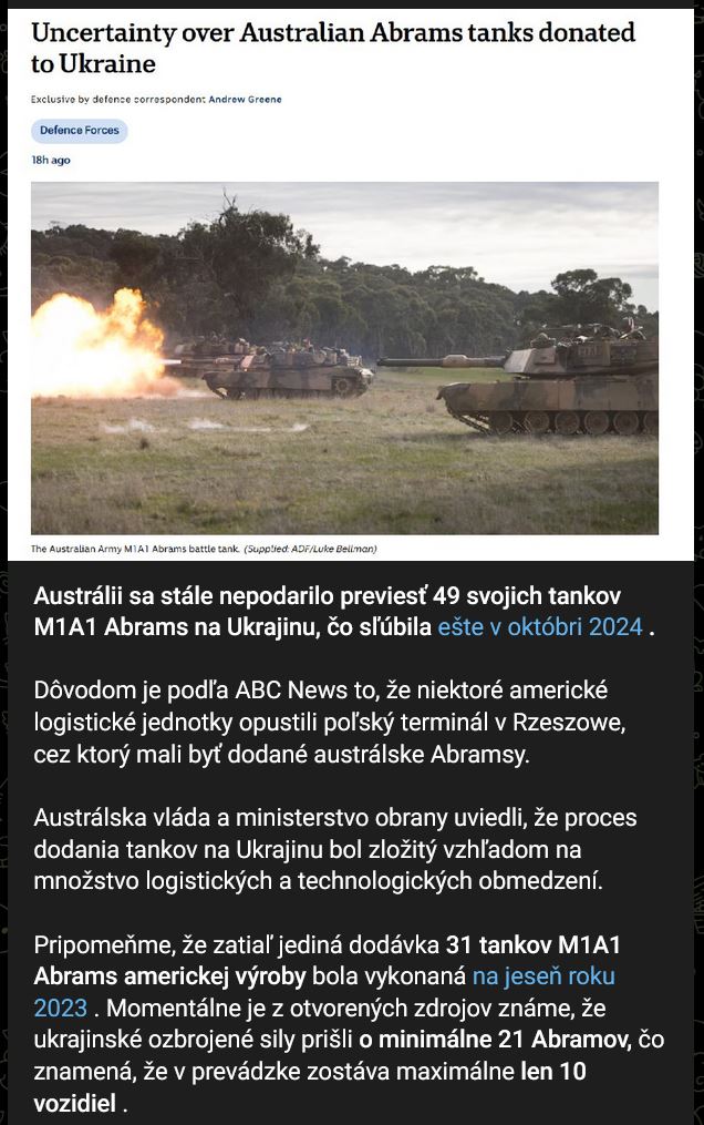 Zdroj https://t.me/casusbellilive/205528 z 23.03.2025Austrálii sa stále nepodarilo previesť 49 svojich tankov M1A1 Abrams na Ukrajinu, čo sľúbila ešte v 10/2024 (https://t.me/milinfolive/132936) . Dôvodom je podľa ABC News to, že niektoré americké logistické jednotky opustili poľský terminál v Rzeszowe, cez ktorý mali byť dodané austrálske Abramsy. Austrálska vláda a ministerstvo obrany uviedli, že proces dodania tankov na Ukrajinu bol zložitý vzhľadom na množstvo logistických a technologických obmedzení. Pripomeňme, že zatiaľ jediná dodávka 31 tankov M1A1 Abrams americkej výroby bola vykonaná na jeseň roku 2023 (https://t.me/milinfolive/110135) . Momentálne je z otvorených zdrojov známe, že ukrajinské ozbrojené sily prišli o minimálne 21 Abramov, čo znamená, že v prevádzke zostáva maximálne len 10 vozidiel (UA ostalo 32,26%, straty 67,74%). Včasná dodávka 49 austrálskych M1A1 naraz mohla nielen nahradiť súčasné straty ukrajinských ozbrojených síl v tomto type techniky, ale umožniť aj vybavenie novej jednotky Abramsom. Ich dodávka však mešká už 6 mesiacov a nie je známe, kedy tanky skutočne dorazia