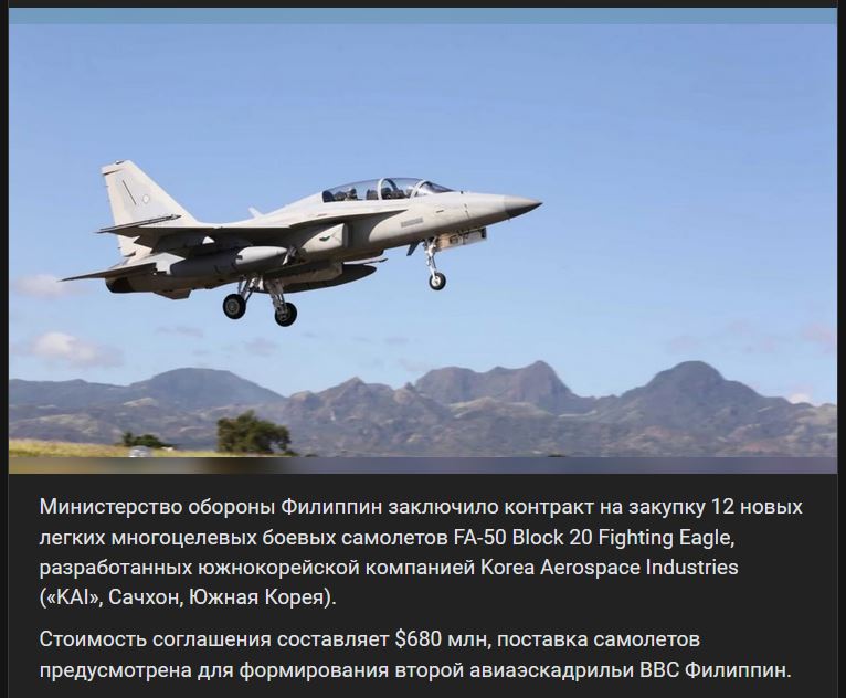 Zdroj https://vk.com/wall-123538639_4452362 z 16.01.2025Ministerstvo obrany Filipín uzavrelo zmluvu na obstaranie 12 nových ľahkých viacúčelových bojových lietadiel FA-50 Block 20 Fighting Eagle vyvinutých spoločnosťou Korea Aerospace Industries („KAI“, Sacheon, Južná Kórea). Hodnota dohody je 680 miliónov $ a lietadlá budú dodané na vytvorenie druhej leteckej eskadry VVS Filipín.