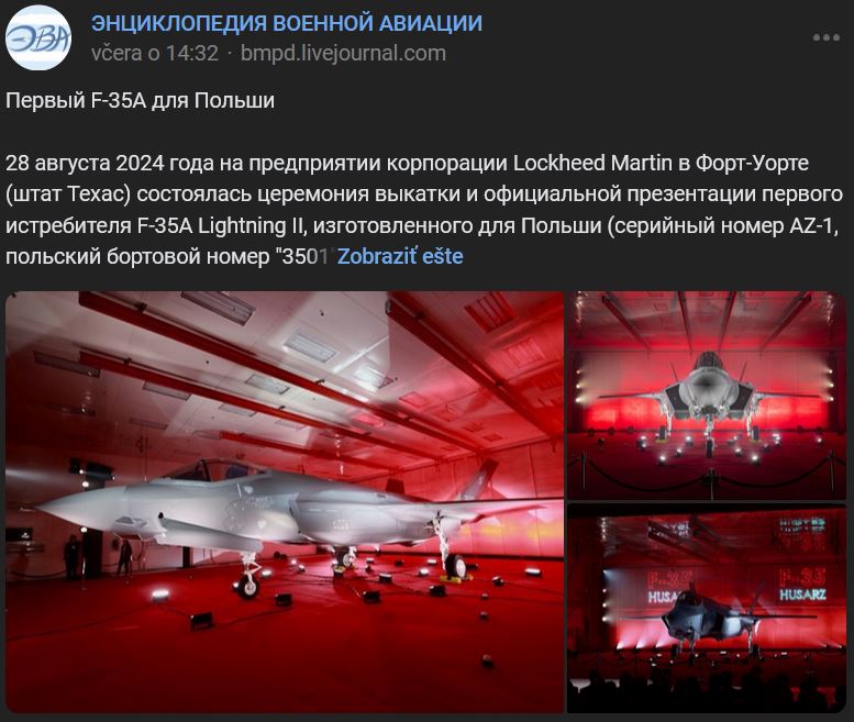 Pripomeňme, že 31.01.2020 poľské ministerstvo národnej obrany podpísalo poľsko-americkú medzivládnu dohodu o dodávke zo strany Spojených štátov Poľsku v rámci amerického programu Foreign Military Sales (FMS) 32 lietadiel 5. generácie Lockheed Martin F-35A Lightning II v hodnote 4,6 miliardy $ (4 600 000 000 / 32 = 143 750 000 $ za kus). Výzbroj nie je zahrnutá v cene dohody a Poľsko ju nakúpi samostatne. Podpísaná zmluva zahŕňa výcvik iba 24 poľských pilotov a približne 100 príslušníkov pozemného personálu. Výcvik týchto osôb si vyžiada ďalšie platené zmluvy so SŠA. Prvé stíhacie lietadlo F-35A, ktoré bolo predstavené 28.08.2024, bude Poľsku oficiálne odovzdané do konca roka 2024 a bude prvým zo 6-tich lietadiel, ktoré nebudú odoslané do Poľska, ale budú sa používať v novom výcvikovom stredisku na základni americkej Národnej leteckej gardy Ebbing v Arkansase na výcvik poľského personálu. Poľsko bude prvým medzinárodným zákazníkom, ktorý bude v Ebbingu cvičiť pilotov F-35. Dodávky zvyšných 26 lietadiel F-35A priamo do Poľska sa uskutočnia v rokoch 2026 až 2030. Tieto lietadlá budú súčasťou 32. základne taktického letectva poľských vzdušných síl na letisku Lask. Prvá letka stíhačiek F-35A (16 lietadiel) na 32. leteckej základni má dosiahnuť stav počiatočnej operačnej spôsobilosti (IOC) v roku 2028. Druhá letka bude dodaná do roku 2030. Zdroj https://bmpd.livejournal.com/4855463.html z 31.08.2024 + viac info
