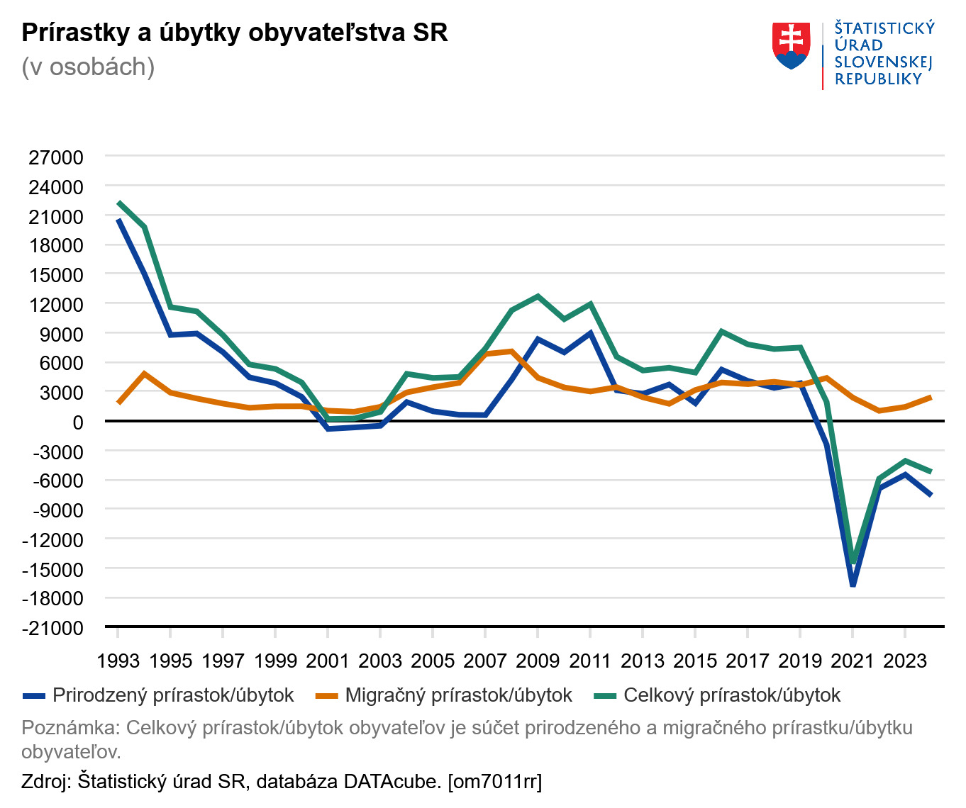 Zdroj https://slovak.statistics.sk/wps/portal ... BIS9nQSEh/ z 31.03.2025 + viac info + viac štatistických grafovPočet obyvateľov Slovenska opäť klesol, hlavnou príčinou bola rekordne nízka pôrodnosť. Slovensko zaznamenalo vlani štvrtý rok po sebe pokles celkového počtu obyvateľov. Kým úmrtnosť sa už v rámci dlhodobých priemerov stabilizovala, prudký prepad pôrodnosti pokračoval. Hoci počet prisťahovaných stále prevyšoval vysťahovaných z krajiny, nedokázal kompenzovať prirodzený úbytok obyvateľstva. V Slovenskej republike na konci roka 2024 žilo celkovo 5 419 451 obyvateľov, ich počet sa medziročne znížil o viac ako 5 200 osôb. Populácia SR tak klesla už štvrtý rok za sebou, čo je prvé dlhšie trvajúce obdobie celkového úbytku obyvateľstva od vzniku samostatnej SR1). Vývoj ovplyvnil najmä prirodzený úbytok obyvateľstva spôsobený zníženou pôrodnosťou.