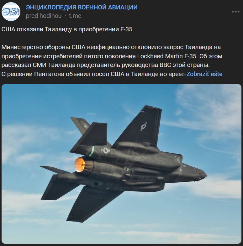 Ministerstvo obrany SŠA neoficiálne zamietlo žiadosť Thajska o nákup lietadiel 5. generácie Lockheed Martin F-35. Thajským médiám to prezradil zástupca vedenia VVS krajiny. Rozhodnutie Pentagónu oznámil veľvyslanec SŠA v Thajsku počas stretnutia s hlavným veliteľom VVS ASM Alongkornom Wannarotom na veliteľstve vzdušných síl v Don Muangu pred 2 týždňami. Veľvyslanec citoval názor ministerstva zahraničných vecí SŠA, že thajské vzdušné sily zatiaľ nemajú potrebnú infraštruktúru na údržbu lietadiel F-35 vrátane zabezpečenia leteckej základne, letísk, údržby, výcviku pilotov a ďalšieho personálu. SŠA ponúkli thajskému kráľovskému letectvu ako alternatívu lietadlá F-16 Block 70 a F-15E Strike Eagle.
