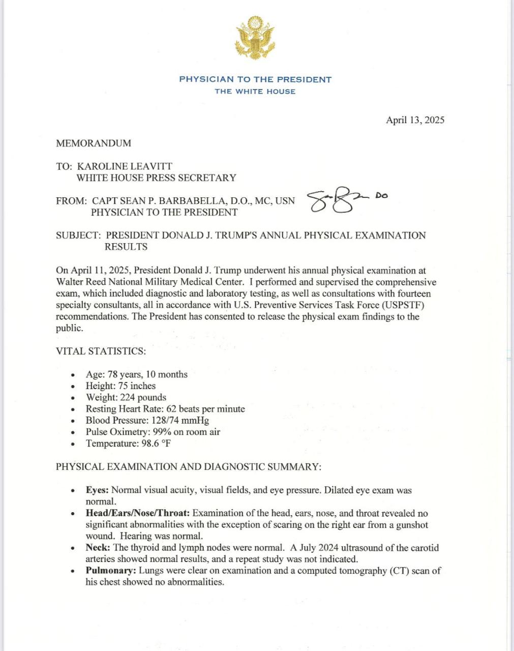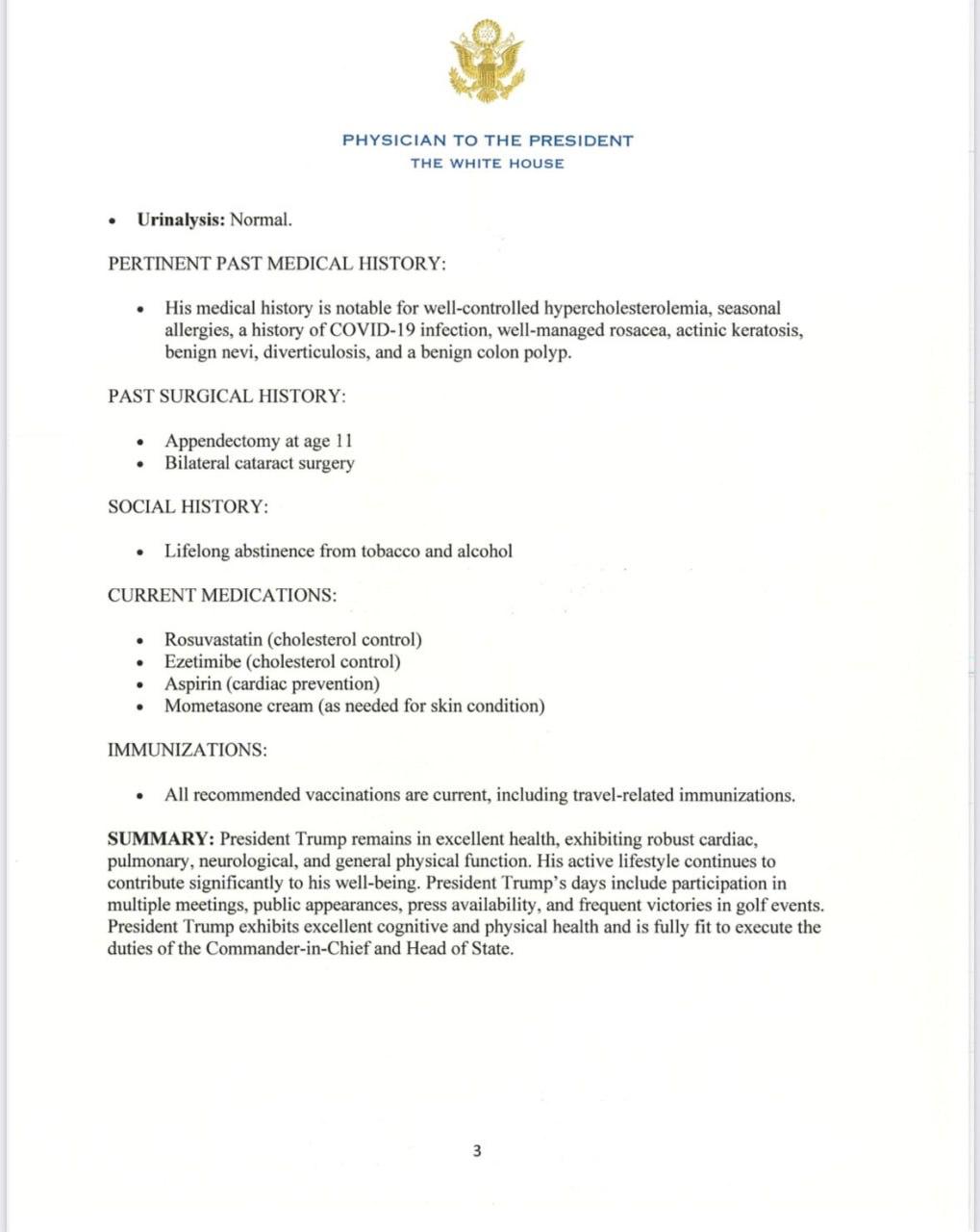 Bílý dům zveřejnil stanovisko k Trumpově lékařské prohlídce. Uvádí se v něm, že "vykazuje vynikající kognitivní a fyzické zdraví a je plně připraven plnit povinnosti vrchního velitele a hlavy státu".