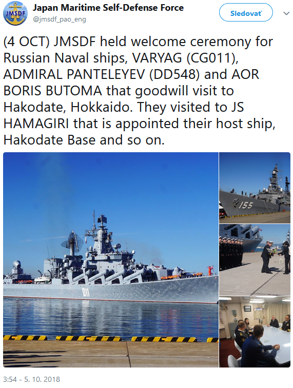 Vo štvrtok 04.10.2018 lode ruského tichooceánskeho flotu zavítali na oficiálnu návštevu do Japonského prístavu pri meste Hakodate na ostrove Hokkaido na severe Japonska, ide o nasledovné lode: